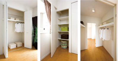 センタードア廻りや、キッチン廻りに豊富な収納スペースをつくりました。 ちょっとした小道具や、日頃あまり使わないものなどを置くために、あると便利な収納です。