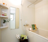 1216(A〜Fタイプ)・1317(G・Hタイプ)の広々バスルーム。G・Hタイプの床には短時間乾燥で好評のモザイクパターンを採用。汚れを含んだ水溜まりの形成を防ぎ排水するので、すばやく乾燥し、汚れ残りも少なくなります。全タイプ24時間喚起機能付。 |