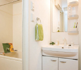 スペースを生かした、使いやすいシンプルな洗面化粧台。シャンプードレッサー付で、収納もあり機能的です。 |