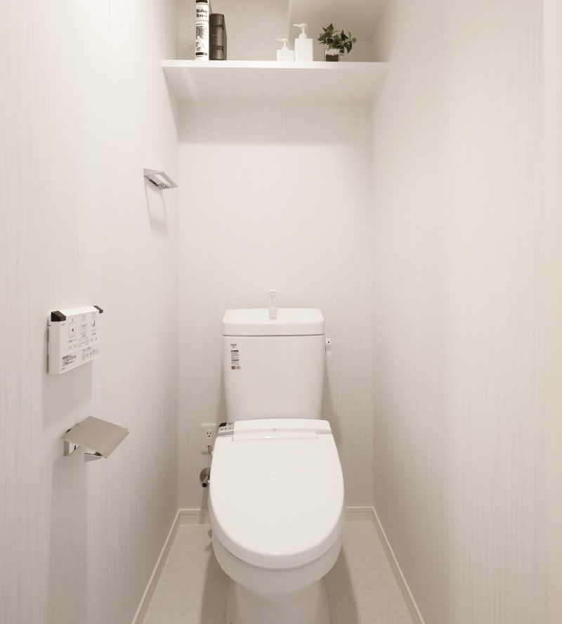 小物やトイレットペーパーのストックに便利な壁付けの棚を採用しています。